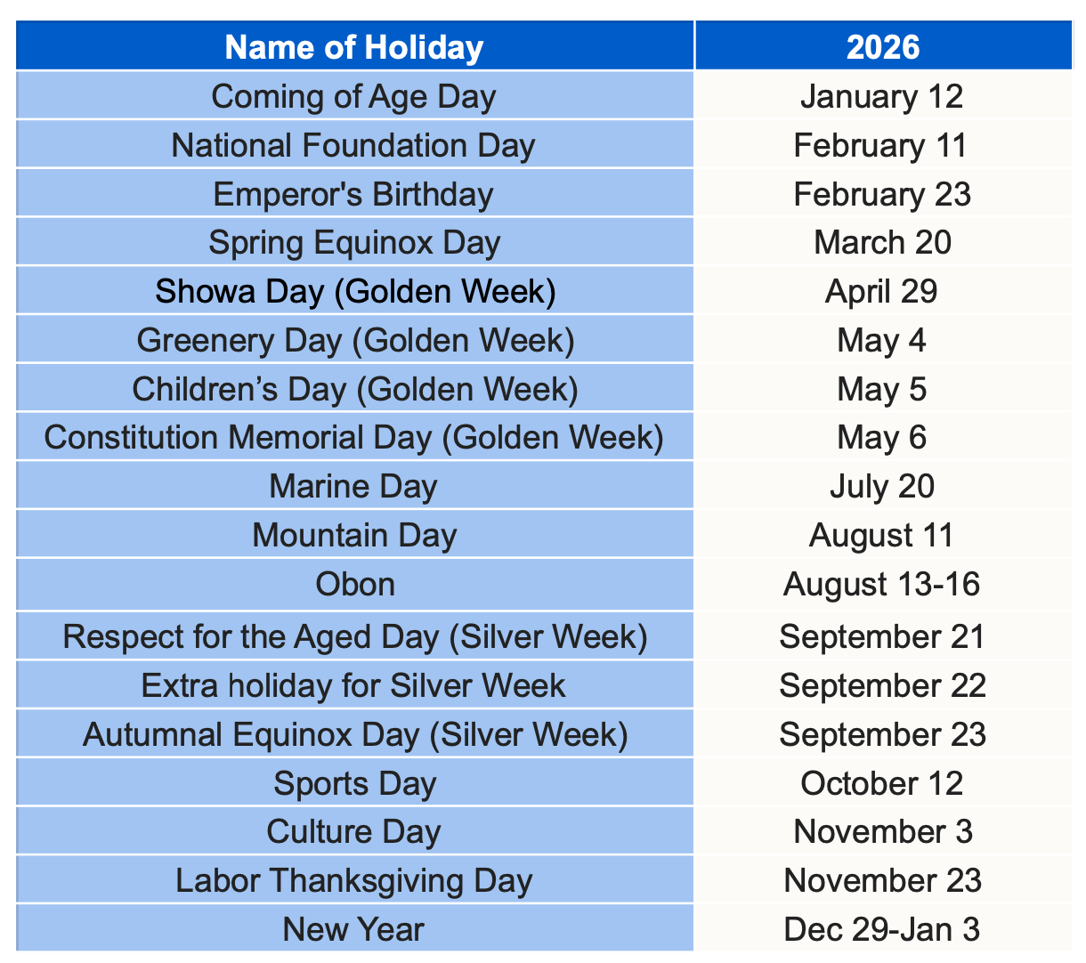 La tabella seguente riporta le festività nazionali giapponesi per il 2026.
