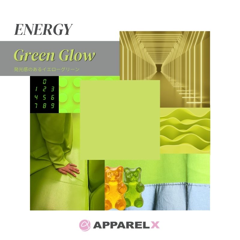 Con le tendenze revival Y2K e Heisei in pieno fermento, questo colore giallo-verde possiede una qualità luminosa che ricorda la luce al neon o fosforescente. La sua vivacità è esaltata se abbinato a materiali leggeri come nylon e taffetà, o a tessuti lucidi. Se accostato a tonalità scure e semplici, potrebbe diventare un colore d'accento di grande effetto per uno stile autunno/inverno più sobrio.