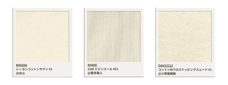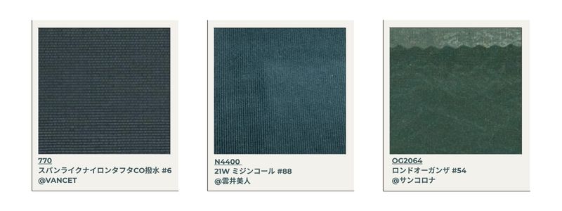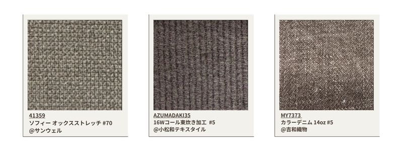 Si dice che questo materiale sia difficile da produrre in Giappone, poiché viene utilizzato per il denim leggero. Tre varianti di colore si ottengono attraverso un attento controllo della concentrazione del colorante.